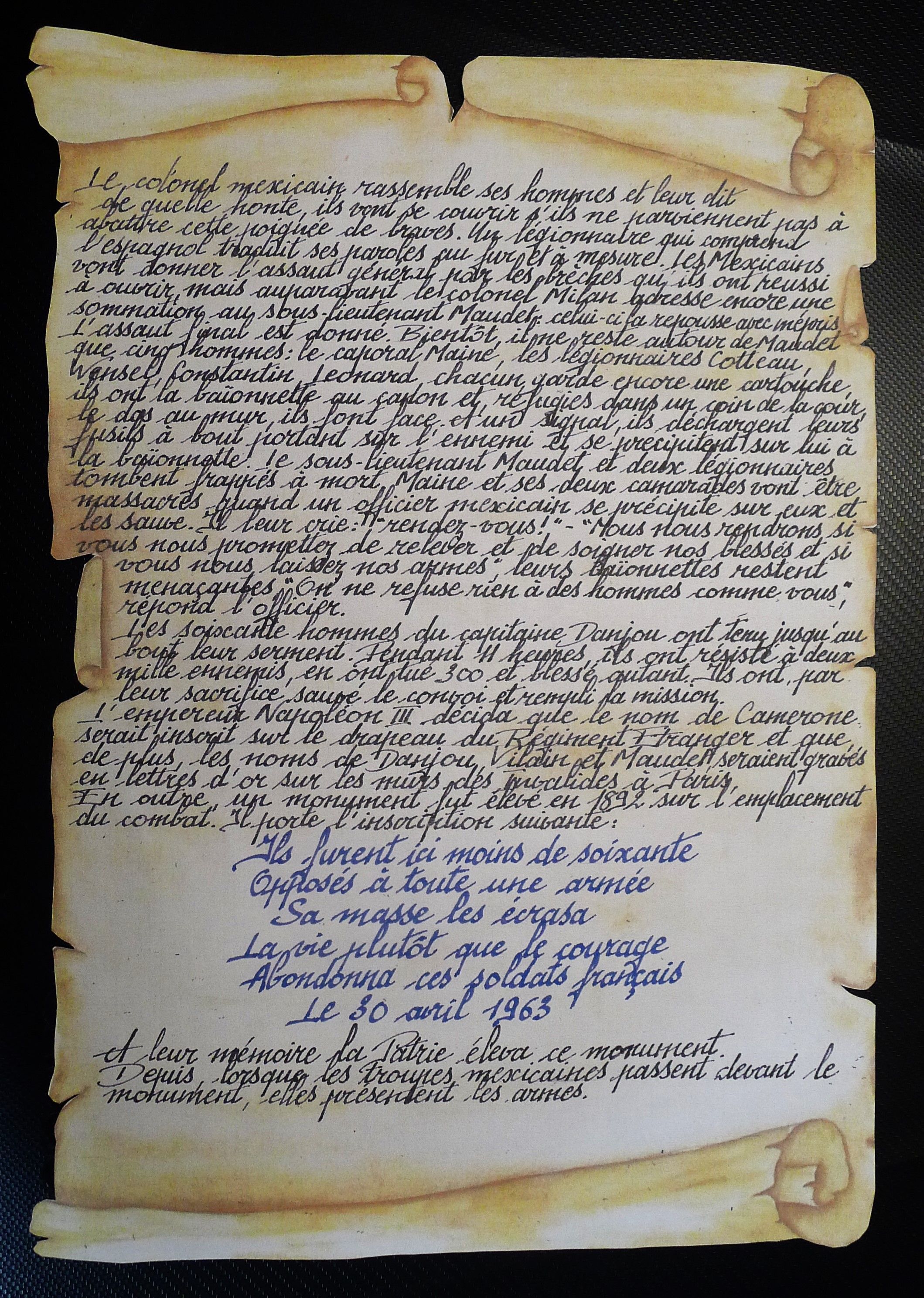 Nuestro amigo Christian Morisot, aficionado a la caligrafía, presenta aquí el texto oficial de la Batalla de Camerone escrito en pergamino.