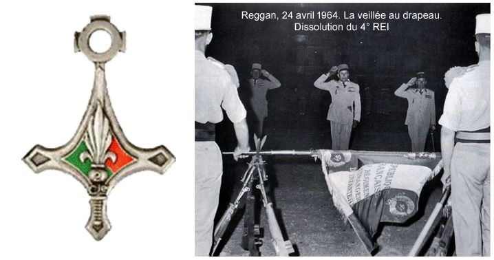 Reggan, 24 y 25 de abril de 1964. En presencia del General Lefort, Inspector de la Legión, el General Spitzer, excomandante del 1.er Regimiento de Caballería Extranjera (1.er REC), los Coroneles Caillaud, al mando del 2.º Regimiento de Paracaidistas Extranjeros (2.º REP), Le Vert, al mando del 2.º Regimiento de Infantería Extranjera (2.º REI), y de Broissia, al mando del 1.er Regimiento de Caballería Extranjera (1.er REC), se celebraron las ceremonias de disolución del 4.º Regimiento de Infantería Extranjera, comandado por el Coronel Brulé.