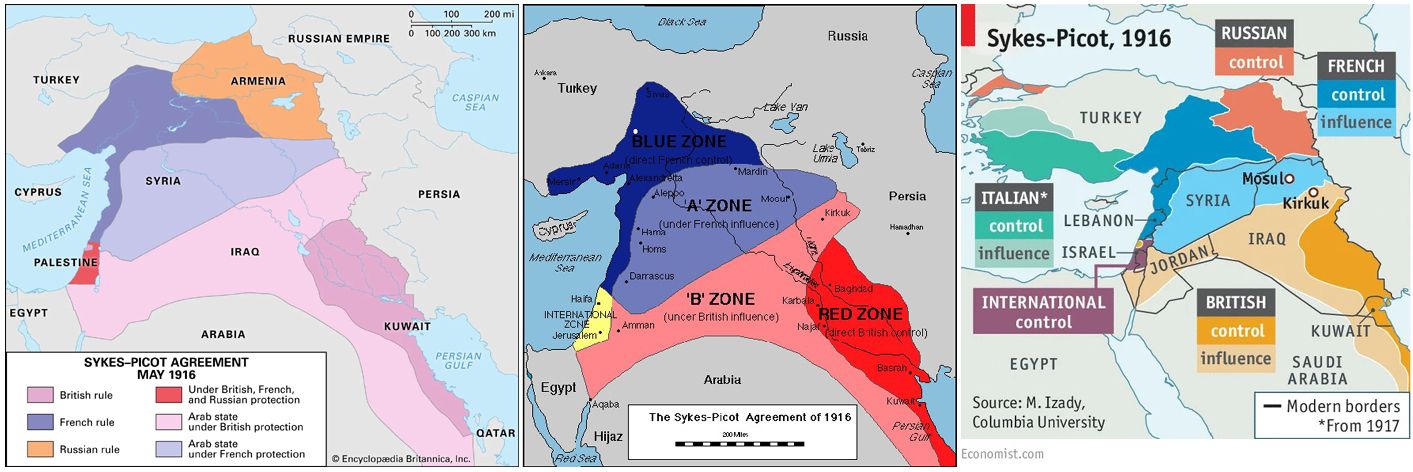 En 1916, Francia y Gran Bretaña firmaron el Acuerdo Sykes-Picot. Este acuerdo secreto estipulaba la división de los territorios árabes del Imperio Otomano entre esferas de influencia europeas. Los negociadores fueron el diplomático británico Mark Sykes y su homólogo francés, François Georges-Picot.