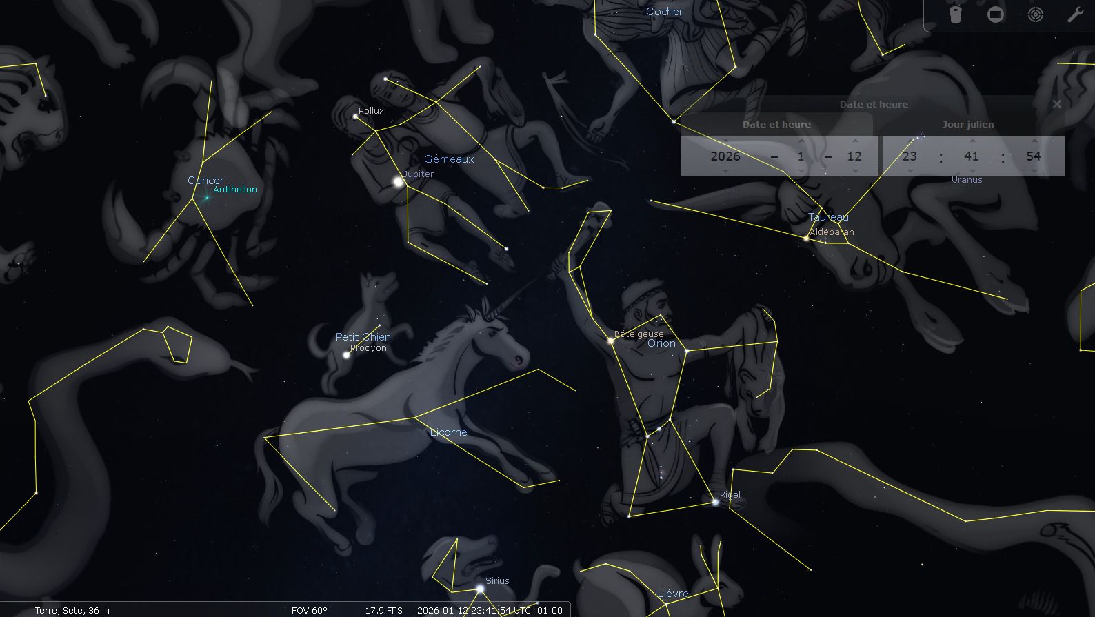 Al anochecer, si mira hacia el horizonte oriental, verá la gran constelación de Orión en el cielo, fácilmente reconocible por su forma trapezoidal. En su centro, tres estrellas, de izquierda a derecha —Alnitak, Alnilam y Mintaka— aparecen perfectamente alineadas. Ya he mencionado esta alineación, similar a la de las pirámides de Giza. A la izquierda de Orión, ligeramente por encima, se encuentra la constelación de Géminis, marcada por Cástor y Pólux. Debajo de Pólux, un punto muy brillante ilumina el cielo: Júpiter, el planeta más grande del sistema solar.
